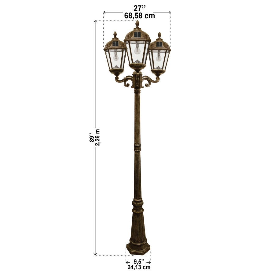 Standing 89 inches tall, this solar lamp post shines brightly through the night and is the perfect touch to any garden, walkway or yard. Installing the Royal Bulb Triple Head Solar Lamp Post in concrete (bolts included) is a simple DIY process that does not require electrical wiring. Once installed, the light will come on automatically at dusk and will last up to 8 hours on a full charge.