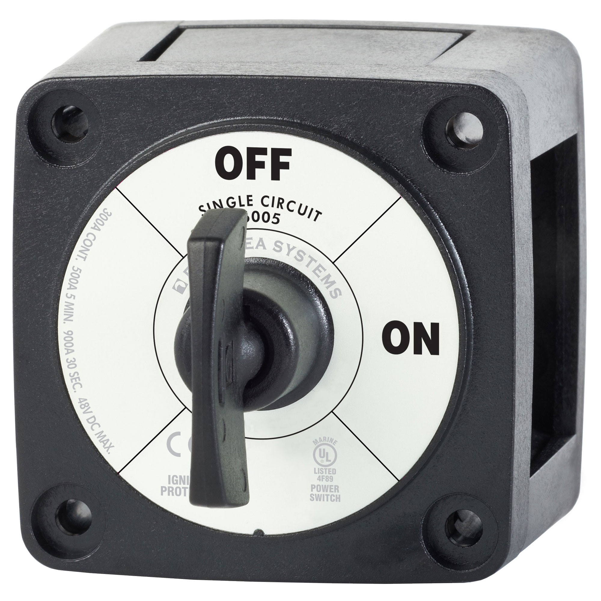 The BS6005 switches a single battery to a single load group. Safe for all outboard motors as well as small gasoline or diesel engines with ignition protection.