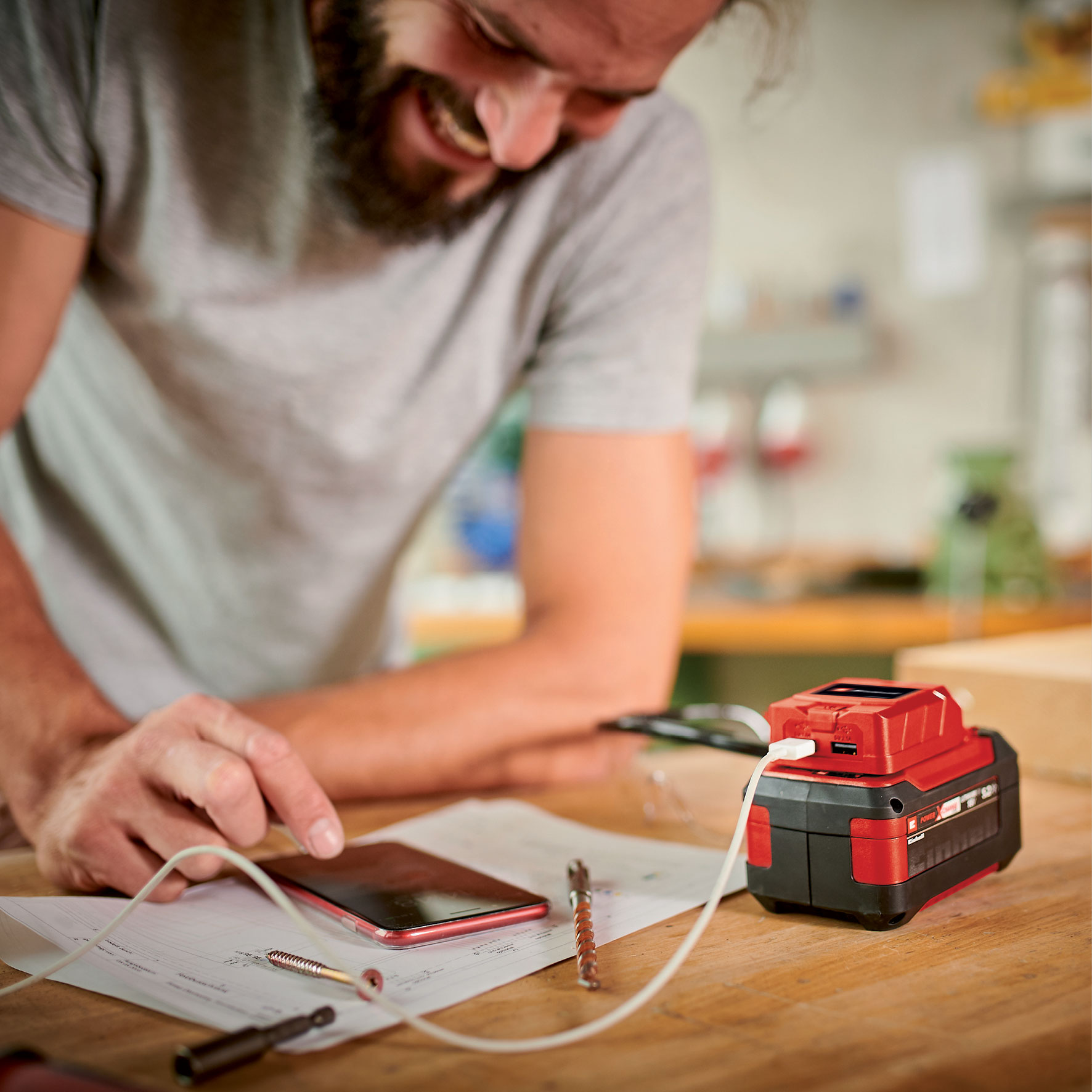 The Einhell USB cordless adapter TC-CP 18 Li USB-Solo is a practical and mobile external power source for charging mobile phones, tablets, MP3 players and many other small power consumers used on the go. As a power supplier, a system battery from the innovative Power X-Change family ensures sufficient power at all times to recharge the batteries of empty consumables. Thanks to 2 USB ports on the housing, up to 2 devices can be charged at the same time. For a fast charging process, a USB port is supplied with a strong 2.1 A charging current. The charging time of the individual devices depends on the battery capacity of the respective connected device. Battery and charger not included as an extra for existing devices the Power X-Change family from Einhell.