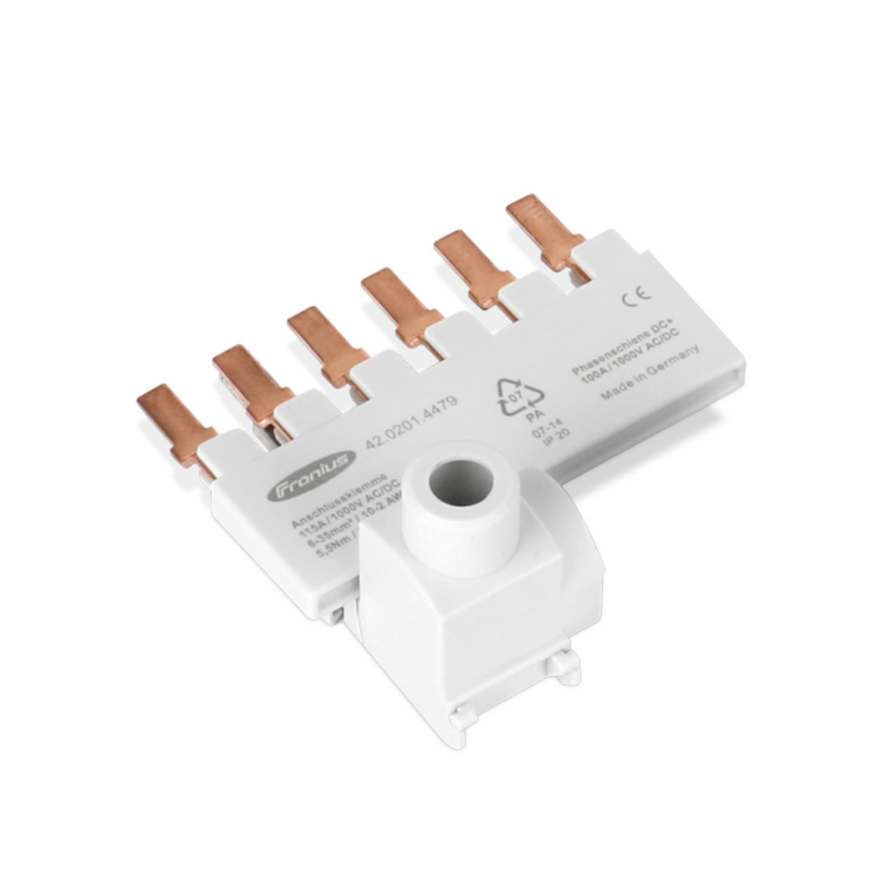 The DC connector kit allows for combining multiple PV strings at the array, and using a single pair of conductors to connect back to the inverter. This is helpful when using a combiner box at the array; having fewer conductors can lower installation costs. Combining strings should only be done with strings of even numbers of modules and the MPPT settings of the inverter should be adjusted. The DC connector kit can accommodate wires from 10 - 2 AWG and the copper “comb style” bus bar is encased in plastic to reduce safety concerns in the connection area. The DC connector kit is particularly suitable for use with the Fronius Symo 10.0 - 24.0 kW and Fronius Primo 10.0 - 15.0 kW inverters.