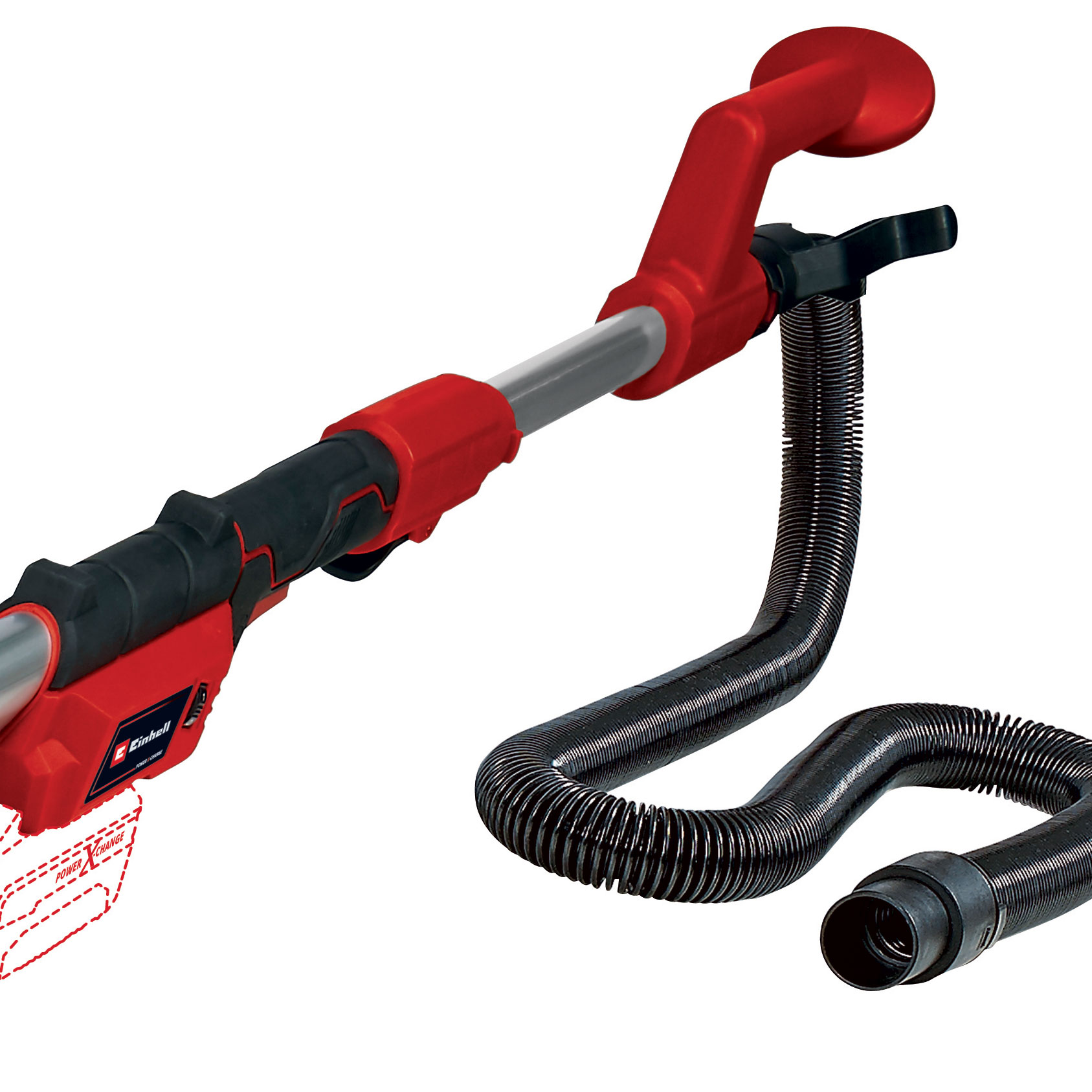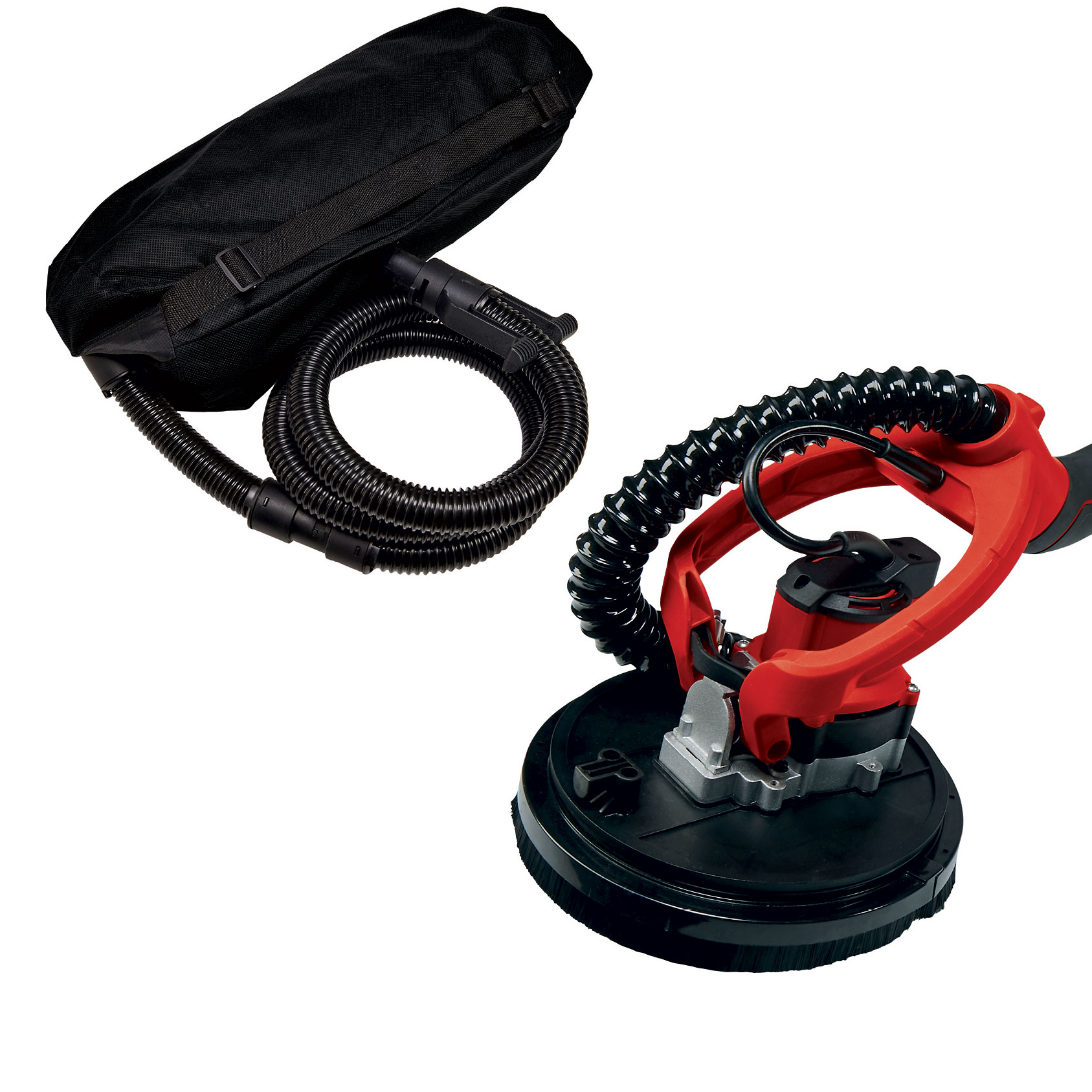The Einhell cordless drywall sander 4259992 is a powerful, flexible member of the Power X-Change family. The drywall sander is an indispensable aid for the sanding of plaster and plasterboard on ceilings and walls during renovation work. The electronic speed control ensures material- and application-appropriate work during use. The cordless drywall sander is easy to use and comfortable in continuous operation thanks to the switch with lock button and the softgrip surfaces. The integrated dust extraction ensures a clean working area, while the brush ring is flexibly rotatable. The spring-mounted sanding plate ensures optimal contact with the wall or ceiling. The sanding plate is equipped with micro hook and loop fasteners. The foldable guide bar makes transport easy and space-saving when stored, and the aluminium extension with additional handle is removable. An extension hose with integrated stand, a dust collection bag with quick-release fastener and shoulder strap as well as 6 pieces of sandpaper, an adapter for connecting a suitable vacuum cleaner are included in delivery. Comes in a practical E-case, does not include a battery or charger. These are available separately.