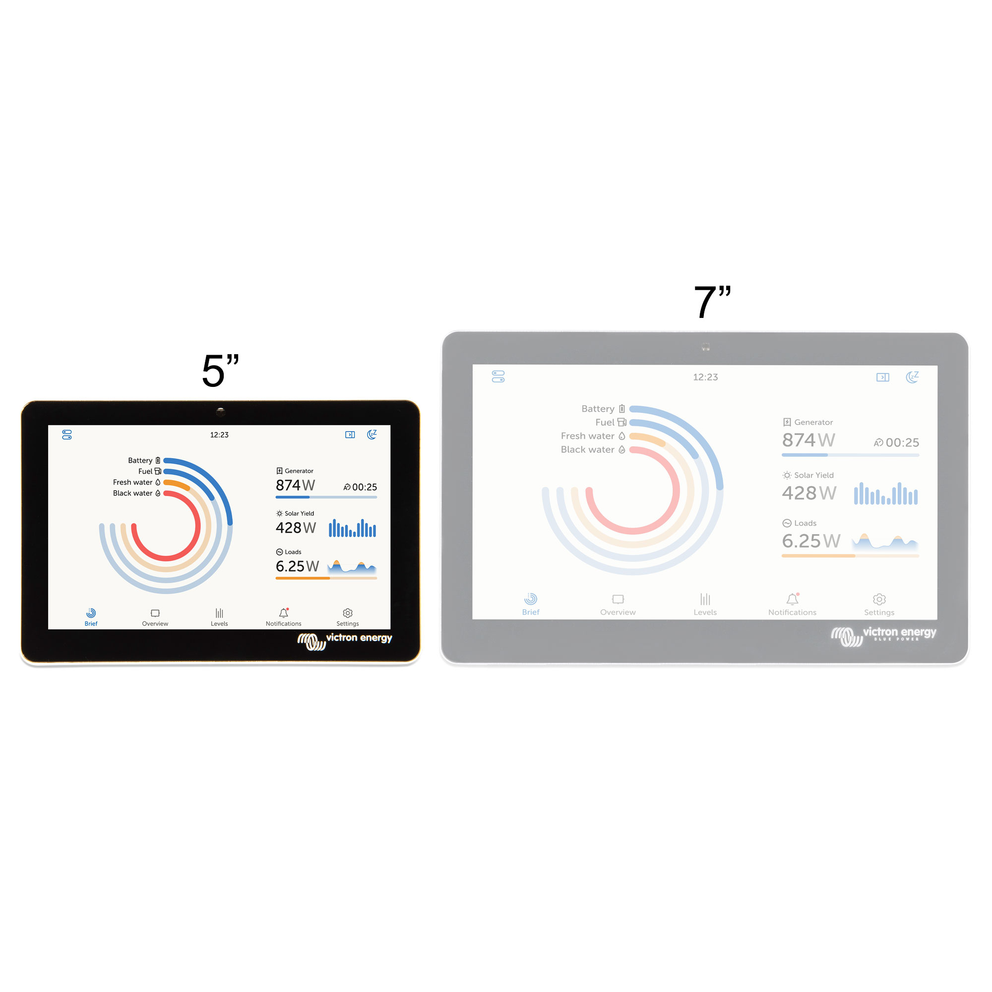 The GX Touch 50 and GX Touch 70 are display accessories for our Cerbo GX. The five inch and seven inch touch screen displays give an instant overview of your system and allow to adjust settings in the blink of an eye. Simply connected to the Cerbo GX with one cable, Their super slim waterproof design, top-mountable setup and simple installation bring a lot of flexibility when creating a crisp and clean dashboard.