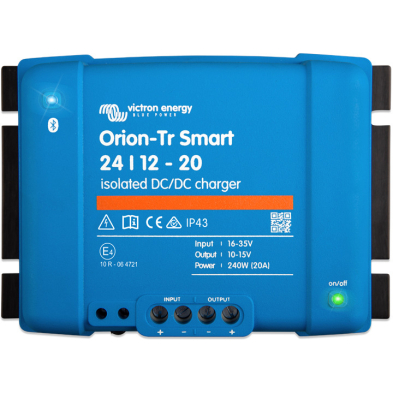 Le chargeur Orion-Tr Smart peut être utilisé dans des systèmes de 12 ou 24 V, et il s'adapte à la fois aux batteries au plomb et au lithium. Les modèles sont disponibles jusqu'à une puissance de 400 W, et un nombre illimité de plusieurs unités peut être raccordé en parallèle pour augmenter la puissance de sortie.