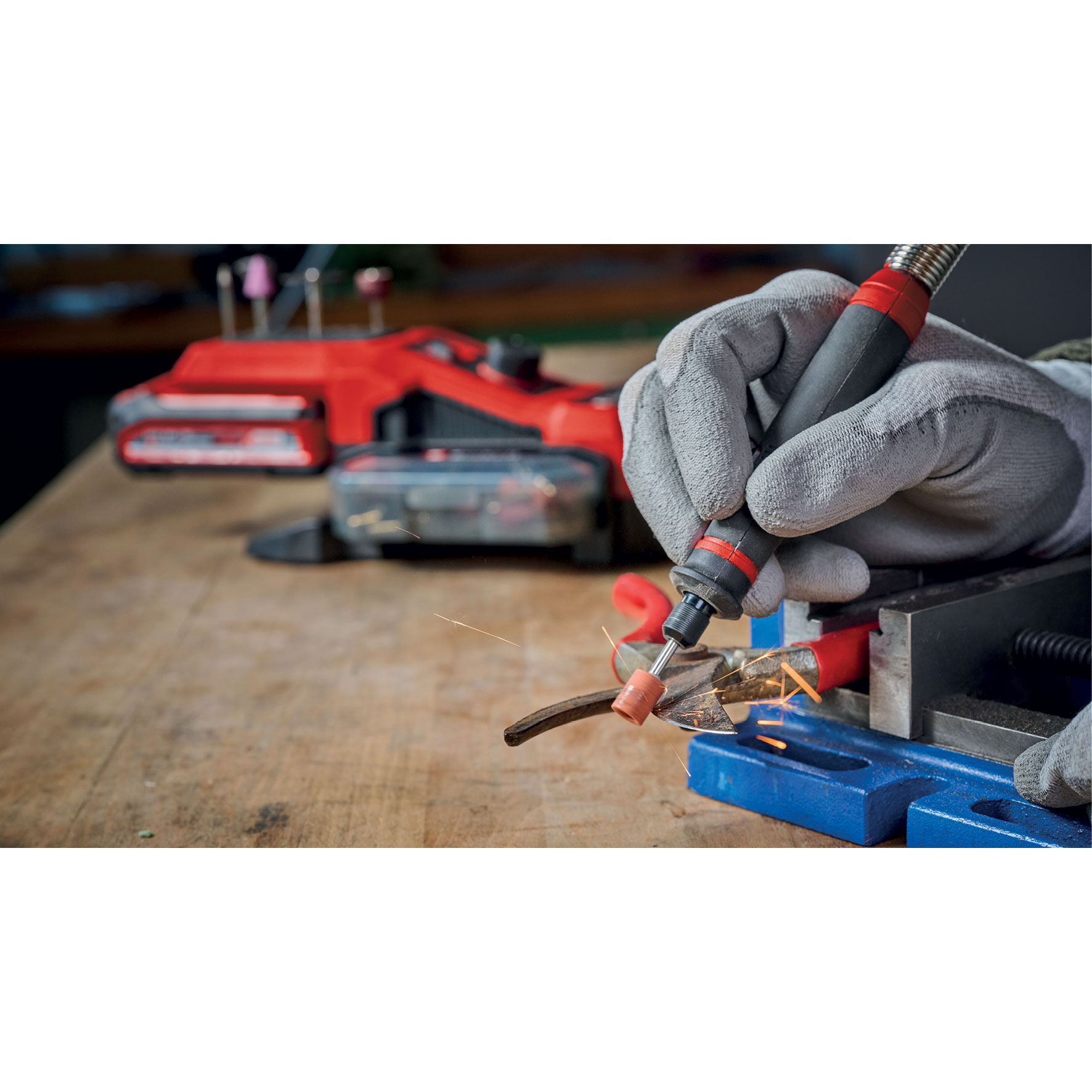La station d'outil rotatif sans fil 4419370 d'Einhell est un appareil très pratique pour réaliser de nombreux travaux, notamment pour graver, polir, fraiser, meuler, découper et brosser. Il fait partie de la gamme Power X-Change d'Einhell, dans laquelle l’ensemble des batteries, chargeurs et appareils peuvent être combinés en toute flexibilité. Le contrôle de vitesse électronique permet d’adapter la vitesse en continu de 5 000 à 34 000 tours par minute en fonction du matériau et de la situation. Le bouton de blocage permet un changement d’outil simple et rapide. La pointe fixée à la tige flexible de 92 cm assure des résultats précis, même pour des travaux de détail et gravures complexes. Grâce à sa forme étroite et à ses surfaces souples, l’outil rotatif ce tient parfaitement en main. La station d'outil rotatif est dotée d’un support très pratique pour la tige et la pointe. Elle comprend également un support pour les accessoires fréquemment utilisés et un compartiment amovible pour accessoires intégré au carter. En fonction du travail à réaliser, la station d'outil rotatif peut être portée directement à l’aide de la bandoulière d’une longueur de 150 cm, accrochée avec le support mural pour un gain de place ou installée en position stable grâce aux pieds en caoutchouc. L’outil est également vendu avec un ensemble complet de 55 accessoires pour un usage quasi universel. La station d'outil rotatif sans fil 4419370 est vendu sans batterie ni chargeur. Ces accessoires sont disponibles séparément.