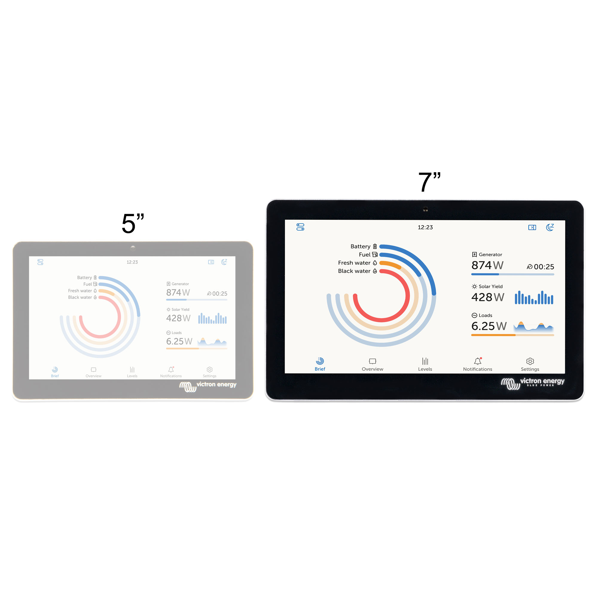 Les accessoires GX Touch 50 et GX Touch 70 sont des écrans pour votre Cerbo GX. Ces écrans tactiles de 5 et 7 pouces vous permettent d'avoir une vue d'ensemble instantanée de votre système et de régler les paramètres en un clin d'œil. Branchés au Cerbo GX simplement avec un câble, leur conception extra-fine et étanche, permettant de l’installer sur l’appareil, et sa facilité d'installation leur donnent une grande souplesse si vous souhaitez créer un tableau de bord propre et net.